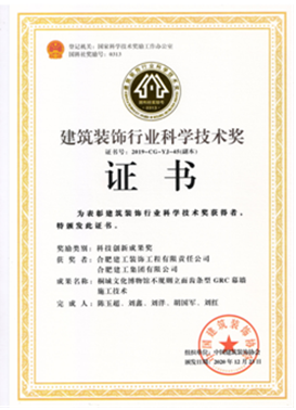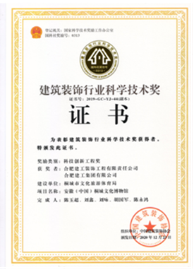 自2019年評選以來,公司申報的“安徽(中國)桐城文化博物館”項目斬獲科技創(chuàng)新工程獎一項,總結(jié)形成的施工技術(shù)成果“不規(guī)則立面齒條型GRC幕墻施工技術(shù)”獲得科技創(chuàng)新成果獎一項,走在安徽省內(nèi)裝飾行業(yè)的前沿。之后相繼獲得兩項科技創(chuàng)新工程獎:合肥市第六十八中學(xué)改擴(kuò)建項目-綜合樓工程,六安市兒童醫(yī)院、金安區(qū)婦幼保健院醫(yī)療病房綜合樓裝飾裝修工程;兩項科技創(chuàng)新成果獎:“一種可開啟180度的裝飾消火栓暗門”,“ 基于3D建模技術(shù)高支模結(jié)構(gòu)與裝飾結(jié)構(gòu)共用盤扣腳手架安裝技術(shù)”。其中“一種可開啟180度的裝飾消火栓暗門”科技創(chuàng)新成果更是獲得一等獎的好成績。