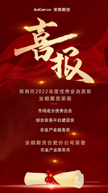 1月30日,鄭州商品交易所發(fā)布關(guān)于表彰2022年度優(yōu)秀會員的決定,安糧期貨榮獲鄭商所“市場成長優(yōu)秀會員”“綜合業(yè)務(wù)平臺建設(shè)獎”“農(nóng)業(yè)產(chǎn)業(yè)服務(wù)獎”三項榮譽,安糧期貨合肥分公司在產(chǎn)業(yè)服務(wù)優(yōu)秀營業(yè)部評選中榮獲“農(nóng)業(yè)產(chǎn)業(yè)服務(wù)獎”。