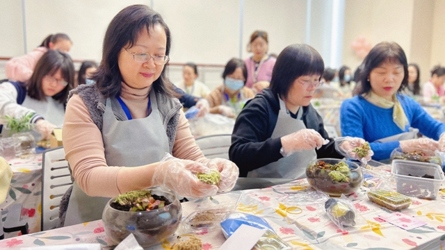 微景觀是將苔蘚、多肉等植物配以砂石、泥土、玩偶裝進(jìn)容器,構(gòu)成妙趣橫生的微觀世界,一個(gè)微景觀本質(zhì)上也是一個(gè)小型生態(tài)系統(tǒng)。女職工們?cè)诶蠋煹闹笇?dǎo)下開始微景觀DIY活動(dòng),大家認(rèn)真構(gòu)思造型,充分發(fā)揮創(chuàng)造力,不一會(huì)兒,一份份清新雅致的微景觀作品便呈現(xiàn)在大家面前。在家中、辦公室的案頭擺上一盆,勞累疲乏時(shí)抬頭瞥見那一抹綠色,仿佛跌落到一個(gè)簡單純凈的童話世界。