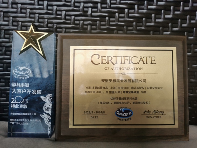安糧實業(yè)獲得優(yōu)鮮沛品牌授權(quán),并榮獲“大客戶開發(fā)獎”,不僅是對安糧實業(yè)在休閑食品原料領(lǐng)域?qū)I(yè)性的認可,也是對我司市場開拓能力的信任。通過共享資源、互換優(yōu)勢,安糧實業(yè)與優(yōu)鮮沛將共同推動休閑食品行業(yè)的發(fā)展,為廣大消費者帶來更多美味、健康的休閑食品,未來安糧實業(yè)與優(yōu)鮮沛的合作會讓更多客戶采購到高品質(zhì)休閑食品原料和新鮮蔓越莓產(chǎn)品。
