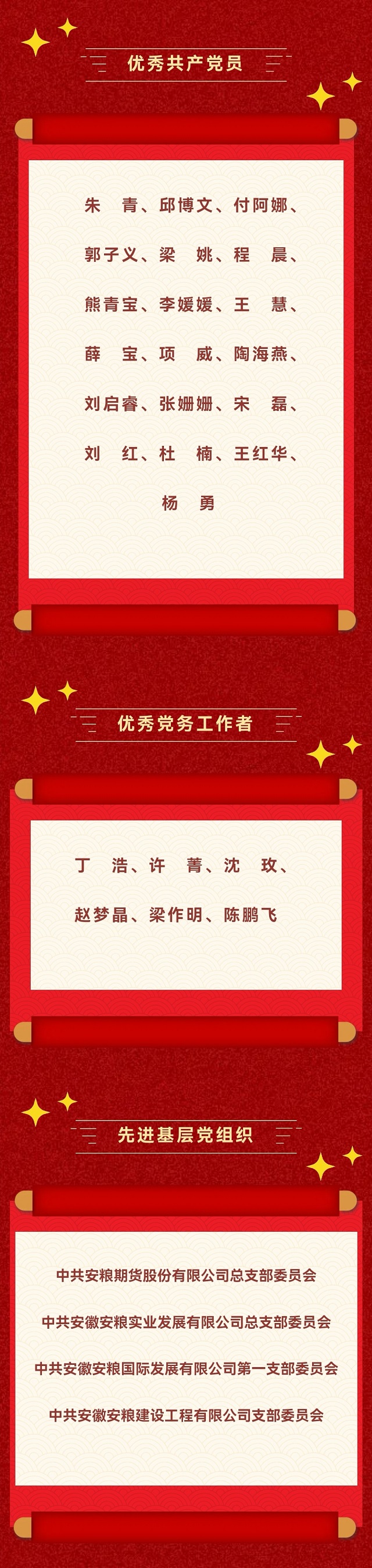 為大力弘揚黨的優(yōu)良傳統(tǒng)和作風(fēng),激勵各級黨組織和廣大黨員更加深刻地領(lǐng)悟“兩個確立”的決定性意義,更加自覺增強“四個意識”、堅定“四個自信”、做到“兩個維護”,努力營造見賢思齊、爭做先鋒的良好氛圍。近日,安徽國貿(mào)黨委對優(yōu)秀共產(chǎn)黨員、優(yōu)秀黨務(wù)工作者和先進基層黨組織進行了表彰,安糧集團19名優(yōu)秀共產(chǎn)黨員、6名優(yōu)秀黨務(wù)工作者和4個先進基層黨組織獲得榮譽。